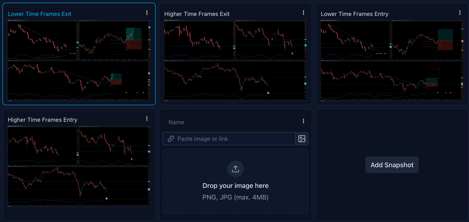 Capture multiple snapshots for each trade to create a detailed visual record of your trading decisions over time.