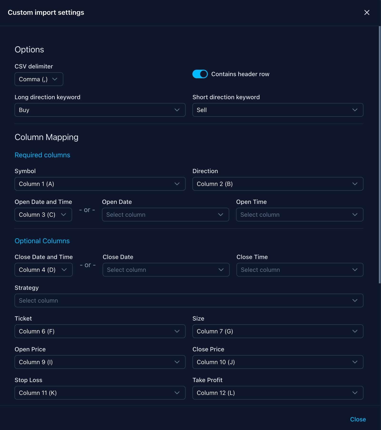 Import trades using a customizable CSV format to match an old spreadsheet based journal or an unsupported broker.